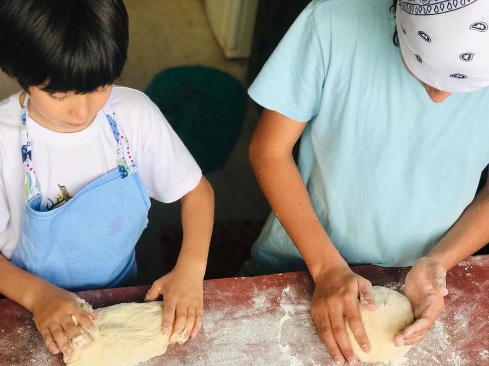 Raul Sá ajudando o irmão a fazer pães caseiros